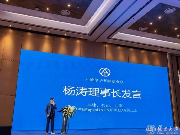 开放原子开源基金会理事长杨涛做《共建、共治、共享--联合构建openDACS开源EDA新生态》的发言,介绍了openDACS项目背景,即构建一个国际化开源EDA工具链项目,帮助芯片及其软硬件设计开发工程师群体,高效与全球同行交流合作,开阔技术视野,实现芯片设计、开发、生产和商用快速迭代。