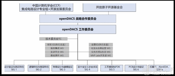 刘明还介绍了openDACS组织结构、战略合作委员会、工作委员会,并宣布了openDACS第一届战略合作委员会、第一届工作委员会组成名单。据介绍,中国计算机学会CCF的集成电路设计专业组、开源发展委员会、开放原子开源基金会是openDACS的联合发起方。战略合作委员会由发起单位、成员单位分管领导组成,对openDACS项目运行过程中的核心事项和重大问题给与指导和支撑。openDACS战略合作委员会各成员单位委派代表参与组建开源电路与系统设计自动化工作委员会(openDACS工作委员会),发挥各自优势牵头开展相应领域的工作事项,由openDACS工作委员会统一协调开展和落实各特别兴趣组(SIG组)及工作组(WG)的相关工作。