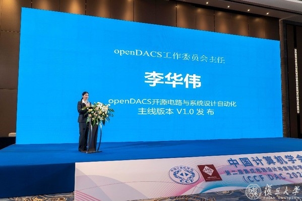 openDACS工作委员会主任、CCF DAC2021程序委员会主席、中科院计算所研究员李华伟代表工委会介绍了openDACS开源电路与系统设计自动化主线版本v1.0。(https://forgeplus.trustie.net/opendacs)