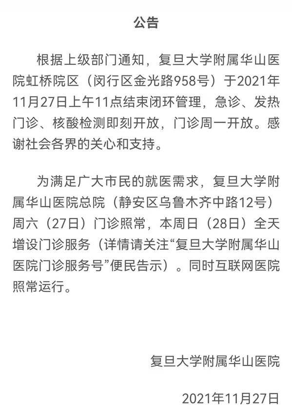 11月27日上午11时,华山医院虹桥院区结束闭环管理