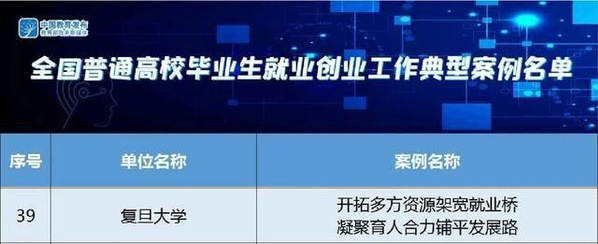 复旦大学“开拓多方资源架宽就业桥,凝聚育人合力铺平发展路”案例入选。