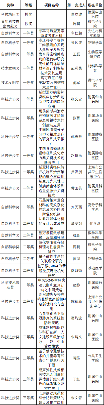 其中科技功臣奖1人,为附属中山医院院士葛均波。青年科技杰出贡献奖1人,为微电子学院教授周鹏。
