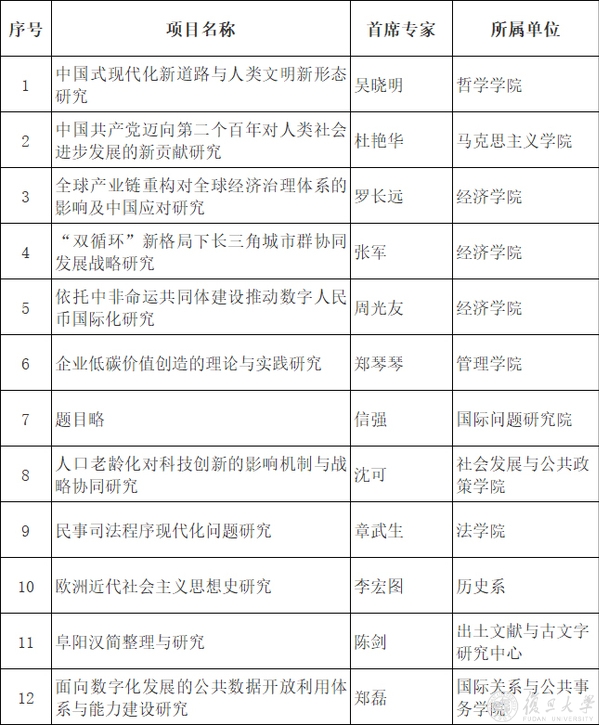 做好社科重大项目申报组织是学校文科科研年度性重点推进工作,按照学校工作要求,我校大力加强对重大项目申报的指导统筹和组织协调,各院系对本次国家社科重大项目申报工作高度重视并给予大力支持。经全力动员,全校共组织30多个项目参加课题竞标。从本次立项的分布情况来看,经济学院3项,哲学学院、马克思主义学院、管理学院、国际问题研究院、社会发展与公共政策学院、法学院、历史系、出土文献与古文字中心、国际关系与公共事务学院等9家单位各1项。具体立项名单如下: