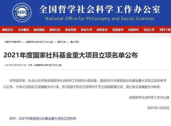 12月6日,全国哲学社会科学工作办公室公布2021年度国家社科基金重大项目立项结果,我校有12个项目获批立项,立项数并列全国高校第二。本次全国共有348个项目获批立项,152家单位获得立项资助。