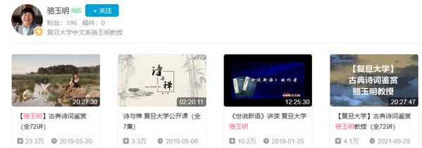 想必已经有“粉丝”发现了骆玉明老师开通了B站帐号,虽然还未上传视频。上课是他的一种生活方式,无论何时何地他都想保持这样一种生活方式。骆玉明将在B站上开一个系列关于古代文学的课程内容,第一部是讲《诗经》,最近他正在策划课程大纲。
