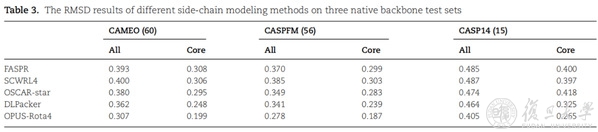 研究人员在三个天然构象测试集中进行了测试,其中CAEMO(60)包含60个测试蛋白,CASPFM(56)包含56个测试蛋白,CASP14(15)包含15个测试蛋白。其结果显示,在三个测试集中,OPUS-Rota4的结果均优于其它侧链建模算法。