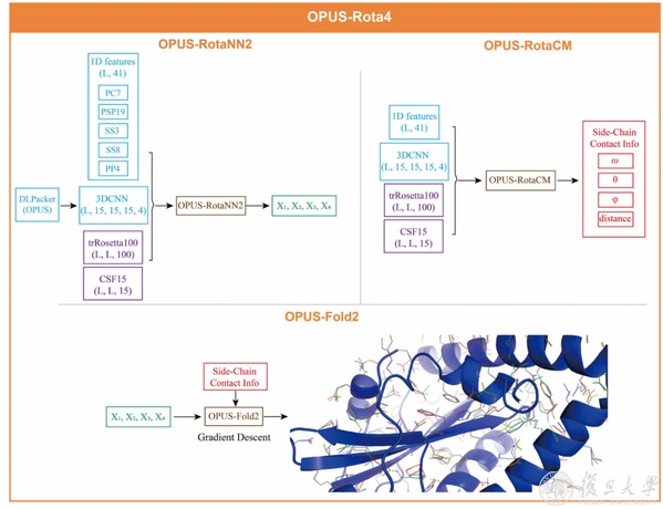 谷歌DeepMind团队的阿尔法折叠2 (AlphaFold2)使用最新的人工智能算法对蛋白质结构实现了接近实验精度的精准预测。这一成果被美国《科学》杂志评为2020年十大科学突破之一。复旦大学复杂体系多尺度研究院教授马剑鹏团队与上海人工智能实验室合作,近日以《OPUS-Rota4: 一个基于梯度和深度学习的蛋白质侧链建模框架》(“OPUS-Rota4: a gradient-based protein side-chain modeling framework assisted by deep learning-based predictors”)为题在《生物信息学简报》(Briefings in Bioinformatics)上发表论文,展示了蛋白质侧链预测算法(OPUS-Rota4 算法),其精度显著超越了谷歌团队的阿尔法折叠算法。 在目前阿尔法折叠算法开源的情况下,复旦团队的算法可以为任何蛋白质结构预测工作提供比阿尔法折叠更准确的侧链模型,从而为蛋白质结构研究,尤其是基于蛋白结构的新药设计工作提供了利器。