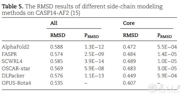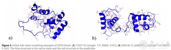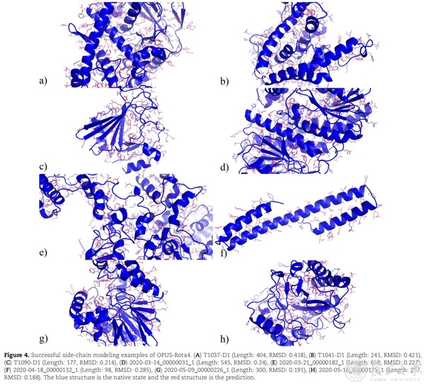 研究人员展示了几个预测较为成功的结构。结果表明,OPUS-Rota4的侧链预测结果和天然构象基本接近,尤其是对于那些位于蛋白质内部的中心残基。