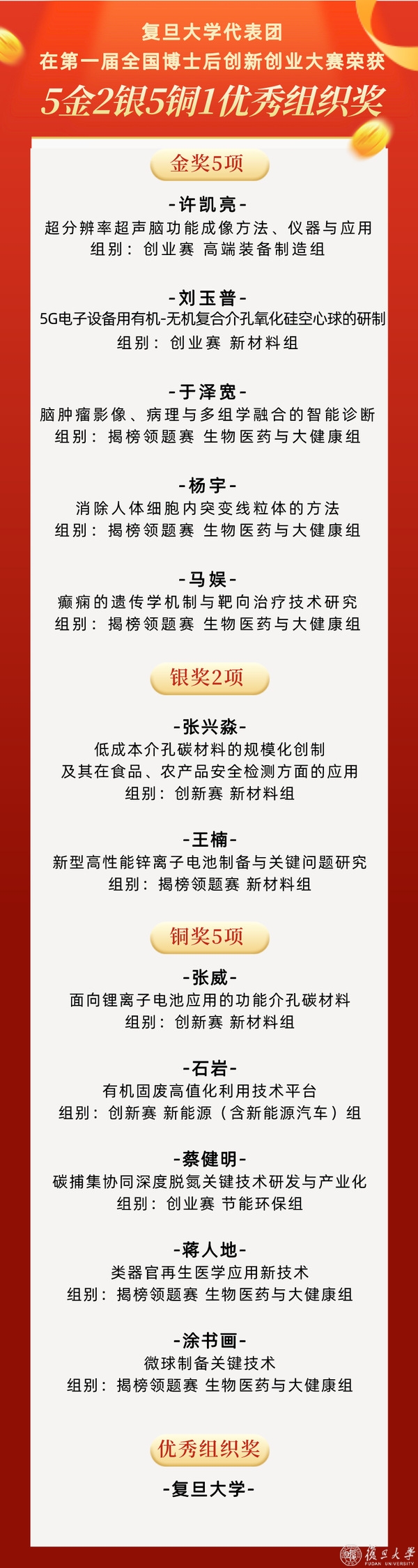 据悉,本次大赛约有1400个团队项目入围决赛,共设金、银、铜奖273个,其中金奖57个、银奖91个、铜奖125个。复旦大学共有30个项目参赛,成功斩获12个奖项,金奖数和获奖数均在全国高校中位列第一,充分展示了复旦博士后坚定创新自信、勇攀科技高峰的时代风采。