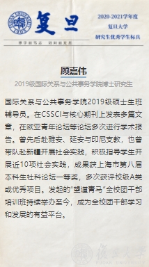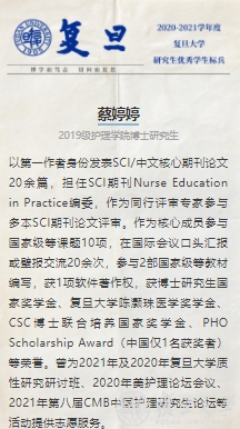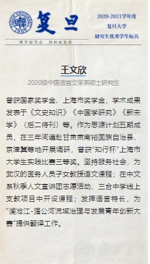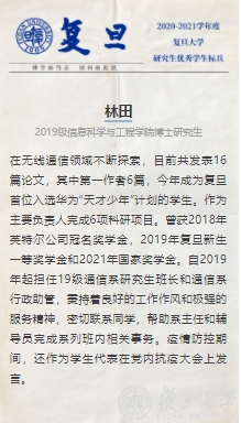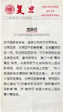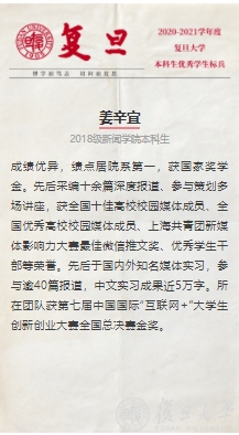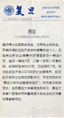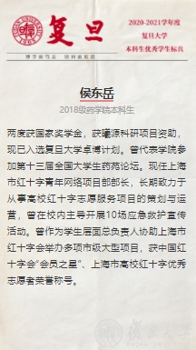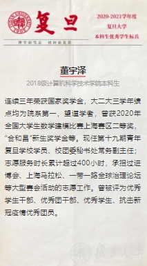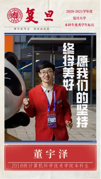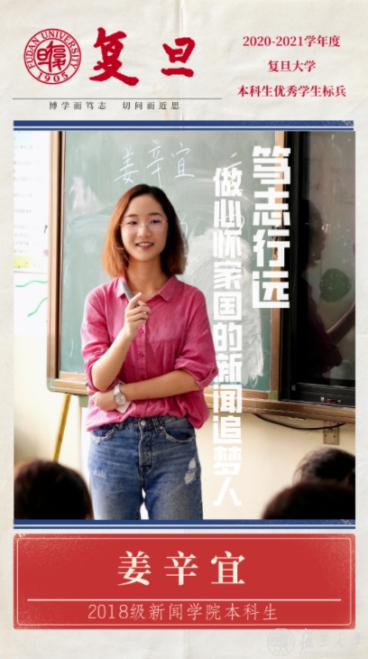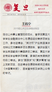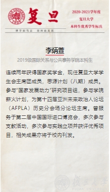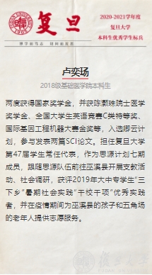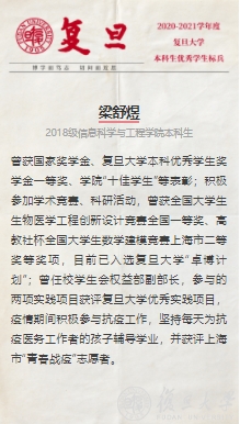 近日,2020-2021学年度复旦大学优秀学生标兵、优秀学生干部标兵、优秀学生集体标兵评审结果出炉,最终遴选出20名优秀学生标兵、20名优秀学生干部标兵和21个优秀学生集体标兵。今天,让我们通过一组“头版”,来认识20位复旦大学优秀学生标兵!