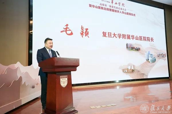 毛颖代表医院致辞,感谢各级政府、复旦大学对医院发展的全力支持,表示医院将以“高质量”“一体化”为关键词,以定位清晰、布局优化、特色鲜明、高效协同的多院区建设进一步放大百年华山“金字招牌”的影响力和服务内涵,在医疗技术、科研创新、人才培养、服务国家重大战略上持续发力,更好彰显委属委管医院保障市民健康、服务人民城市的引领示范作用。