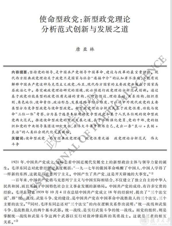 唐亚林《使命型政党: 新型政党理论分析范式创新与发展之道》