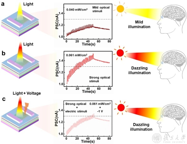 在微电子学院陈琳教授团队的工作中,制备了一种高效、稳定的柔性人工视网膜感知器件,可以同时实现电/离子和光的双调制(图1d)。近日,该工作以Integrated In-sensor Computing Optoelectronic Device for Environment-Adaptable Artificial Retina Perception Application为题,发表于期刊Nano Letters,微电子学院教授陈琳、孙清清为通讯作者,博士生孟佳琳为第一作者。