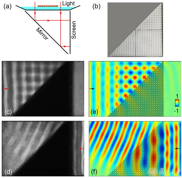 图1. 人工水波棱镜中的单向传播效应。水的表面被465个不动的圆盘所覆盖,圆盘构成一个正方格子阵列,阵列轮廓为等腰直角三角形。 (a) 实验装置示意图。水盛放在一个底部透明、侧面倾斜的容器中。通过使用幻灯片投影装置,水波的图案可投射到屏幕上。 (b) 圆盘阵列的照片。利用3D打印技术,465个圆盘被打印在一块刚性板上。 (c) 和 (d) 实验观测的水波图案。 (e) 和 (f) 模拟的水波图案。若从阵列左侧入射,水波将完全反射【(c) 和 (e)】。反之,若从阵列右侧入射,水波可通过阵列【(d) 和 (f)】。 该单向传输现象,源自于在圆盘阵列中更大的水波相速度。
