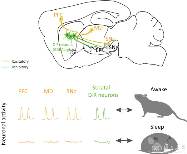神经元钙活动结果显示:纹状体D1R 神经元在觉醒期高度活跃,在NREM睡眠期安静。高频声音刺激、足底电刺激或喷气等提高小鼠觉醒度,均可活化纹状体 D1R 神经元。多通道光纤记录发现:纹状体D1R 神经元的活动与其上游核团神经元高度同步,包括前额叶皮层(prefrontal cortex,PFC)和背内侧丘脑(mediodorsal thalamus,MD)等。化学遗传学抑制上游PFC和MD神经元活性,可减弱纹状体 D1R 神经元活动度。光遗传学激活上游通路(皮质-纹状体、丘脑-纹状体以及黑质-纹状体)可以诱导小鼠觉醒。研究纹状体 D1R 神经元下游通路,发现光遗传激活纹状体-苍白球内侧部 (entopeduncular nucleus, EP, also called GPi)和纹状体-黑质网状部 (substantia nigra pars reticulata, SNr),D1R 神经元释放GABA递质,抑制苍白球内侧部和黑质网状部的睡眠核团,可促进小鼠觉醒。以上结果表明:纹状体 D1R 神经元整合上游信号,通过下游核团(苍白球和黑质)调控小鼠觉醒。