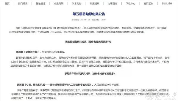 日前,第五届思勉原创奖发布评奖公告,7位学者及其作品分获第五届思勉原创奖、思勉青年原创奖及思勉原创奖提名奖。复旦大学中国语言文学系陈尚君教授所著《全唐诗补编》(中华书局1992年出版)获得第五届思勉原创奖,哲学学院徐英瑾教授所著《心智、语言和机器——维特根斯坦哲学和人工智能科学的对话》(人民出版社2013年出版)获得第五届思勉青年原创奖。此届思勉原创奖,我校2名学者获奖,实现历史突破。此外,另有2名复旦校友获奖。