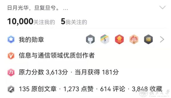 一定要保持自信,相信自己。尤其是到复旦之后,看到身边有些同学会有一些消极,可能经历过低谷的更能体会这一点。我想通过我的切身经验,告诉大家,既然能考入复旦,那就佐证了你在同龄人中拔尖的能力。一时的挫折并不算什么,如果在未来回首这段大学时光时追悔自己没有尽力拼搏过,那才是真正的遗憾。