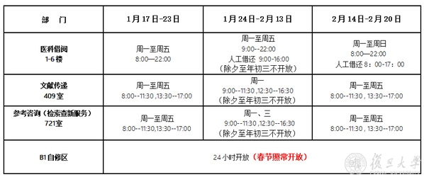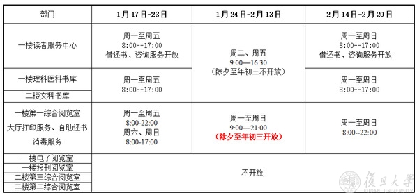 寒假期间,各馆具体开放时间请见附表所示。若在相关阅览室关闭期间需要使用其中书刊资料,请提前和值班老师联系,联系方式详见图书馆主页。