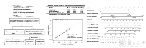 snoRNA是一类小分子非编码RNA,参与核糖体的生物合成以及剪接体的剪切组装,且在血浆中含量丰富,可作为液体活检的潜在生物标志物。研究团队发现,顺铂耐药的三阴性乳腺癌SNORD33表达显著降低,下调SNORD33促进顺铂耐药。进而,在既往一线接受含铂和非铂方案治疗的转移性三阴性乳腺癌患者的血浆样本中发现,血浆SNORD33低水平的患者无进展生存时间(PFS)和总生存时间(OS)显著缩短,血浆SNORD33特异性预测铂类疗效,是使用含铂方案治疗患者PFS的独立预测因子。研究基于肝转移状态、转移灶数目的临床特征及血浆SNORD33水平绘制了预测含铂方案PFS时间的列线阵图,用于预测患者铂类药物治疗不同时间临床缓解可能性,以供临床医生/患者参考,选择治疗方案。