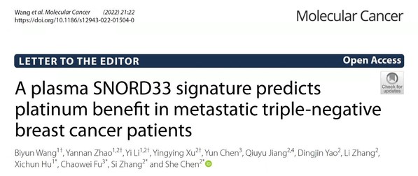 文章信息及链接:Biyun Wang1#, Yannan Zhao1,2#, Yi Li1,2#, Yingying Xu2#, Yun Chen3, Qiuyu Jiang2,4, Dingjin Yao2, Li Zhang2, Xichun Hu1*, Chaowei Fu3*, Si Zhang2*, She Chen2*. A plasma SNORD33 signature predicts platinum benefit in metastatic triple-negative breast cancer patients.
