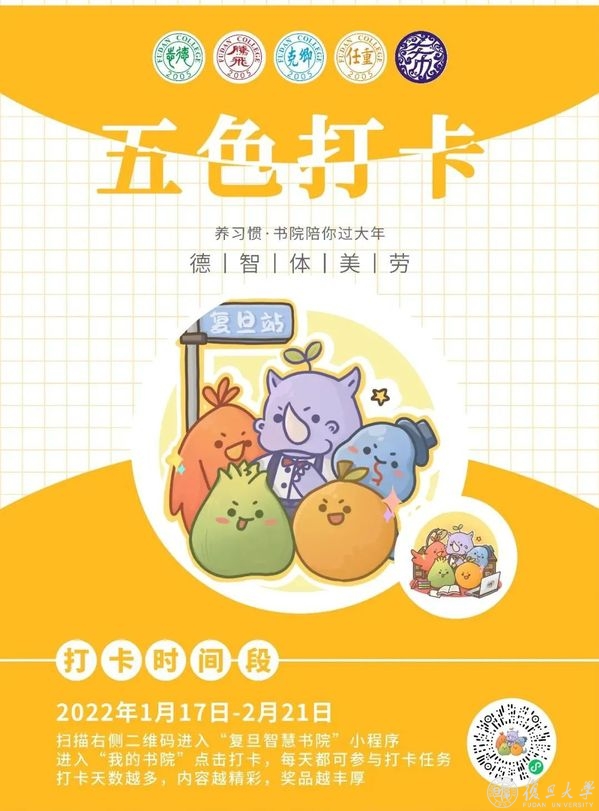 “五色缤纷”既是志德、腾飞、克卿、任重、希德,五个书院的学子各自绽放精彩,也是同学们从德、智、体、美、劳五个维度出发全面发展。为了帮助大家更好地让计划照进现实,书院开启“五色打卡”活动并为自律的小伙伴准备了丰厚的礼品哦~新的一年,一起成为更好的自己吧!