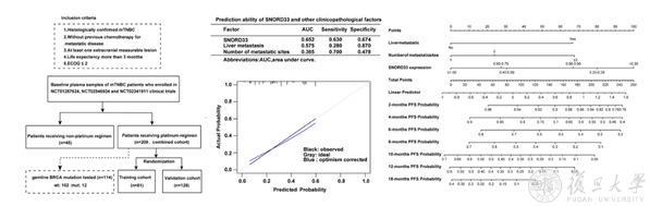 为更好预测铂类治疗三阴性乳腺癌疗效,本研究还通过综合基线肝转移状态、转移灶数目以及血浆中SNORD33 水平这3个重要指标,制作了可以预测含铂一线治疗转移性乳腺癌患者生存时间的列线图。通过对列线图的分析,可对每个患者进行个体化的计算,进而得到对应的不同月份发生进展的概率。即在基线时通过简单的计算判断患者使用含铂方案生存时间长短的概率,弥补了仅通过SNORD33 表达的高低进行预后判断的相对“简略粗糙”的缺点,更加完善血浆SNORD33作为铂类药物预测分子靶标的可行性。