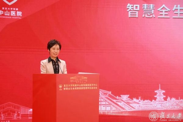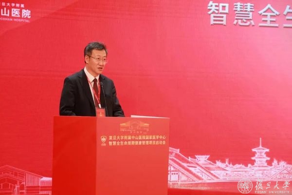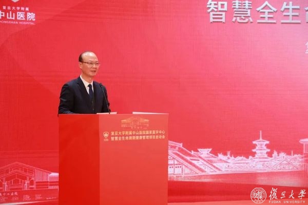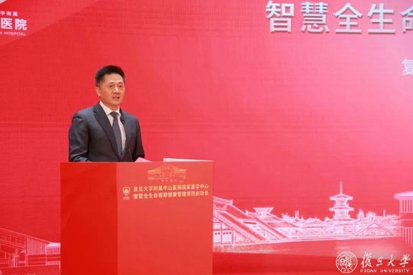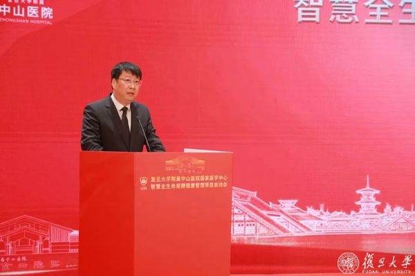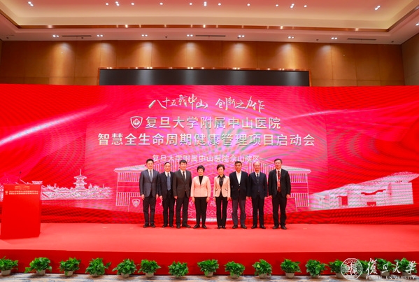 上海市副市长宗明,复旦大学党委书记焦扬,上海市卫生健康委党组书记章雄,上海申康医院发展中心党委书记、主任王兴鹏,复旦大学党委副书记、上海医学院党委书记袁正宏,松江区委副书记韦明,中国科学院院士、复旦大学附属中山医院院长樊嘉,复旦大学附属中山医院党委书记汪昕共同启动“智慧全生命周期”健康管理项目。