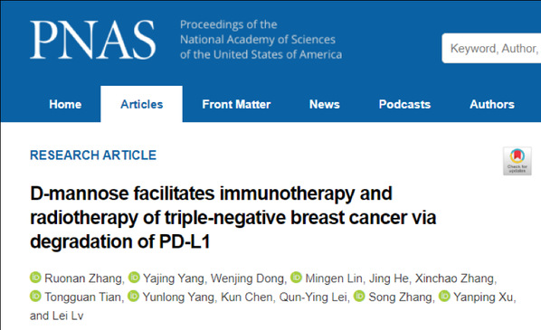 2022年2月22日,复旦大学基础医学院生化系代谢分子医学教育部重点实验室吕雷团队与同济大学徐艳萍团队和南开大学张松团队联合在PNAS上发表了题为D-mannose facilitates immunotherapy and radiotherapy of triple-negative breast cancer via degradation of PD-L1的研究成果。该研究揭示了D-甘露糖可以通过影响PD-L1的糖基化促进其降解,进而提升TNBC免疫治疗和放疗的疗效。