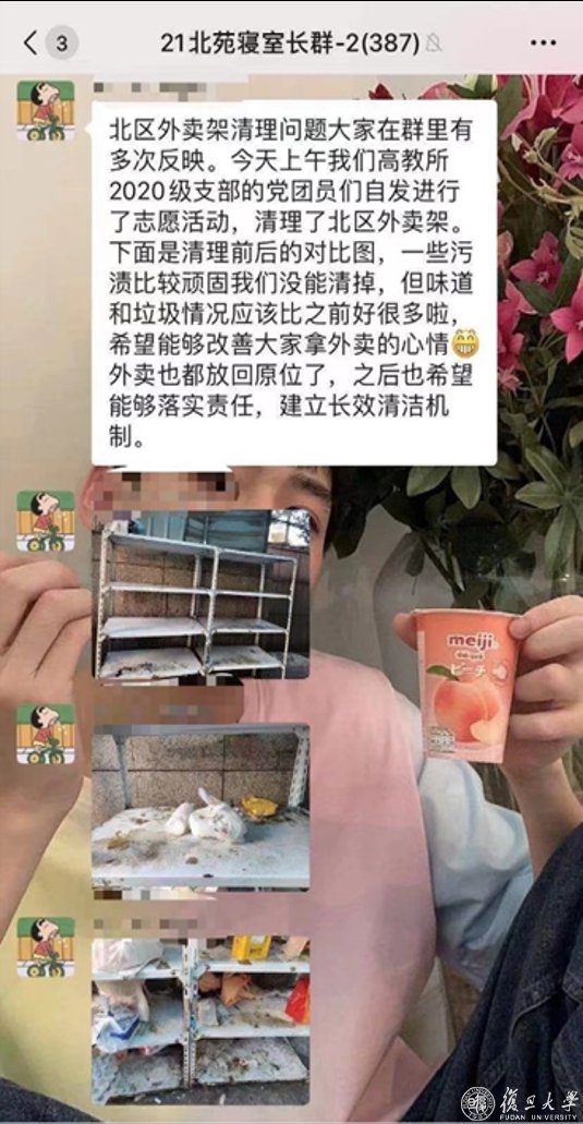 因为外卖忘记取走或打翻,造成垃圾堆积,影响到外卖架使用,群里同学们提出设立标语,清理三天未领取的外卖等各式建议,但效果都不理想。可喜的是2020级高教所党支部的同学们,主动清理了长时间无人领取的外卖,并擦拭整理了外卖架。“我感受到同学们越来越主动的参与到在园区中与自己密切相关的问题的解决上来,我们园委会除了搭建大家共同商议的平台外,也非常支持同学们的行动,还考虑将外卖架清理设为党员志愿服务岗。”北苑园委会主席马茜说。