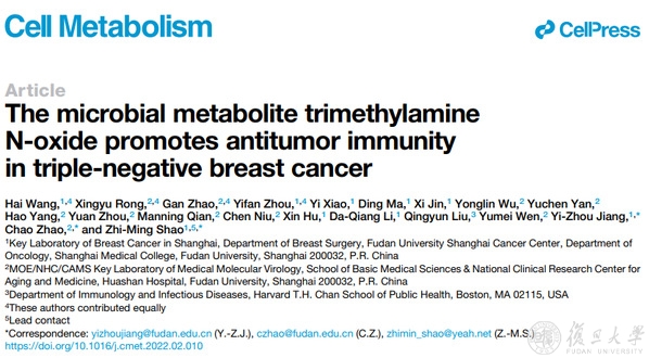 乳腺癌的发病率逐年增高,并成为中国女性发病率最高的恶性肿瘤,是人们常说的“红颜杀手”。其中,三阴性乳腺癌恶性程度较高,患者生存预后较差,易出现早期复发和转移,且既往缺乏有效的针对性治疗策略,素有最“毒”乳腺癌之称。近日,复旦大学肿瘤医院邵志敏教授、江一舟教授课题组携手复旦大学基础医学院教育部/卫健委/医科院医学分子病毒学重点实验室赵超课题组,发现微生物代谢产物氧化三甲胺(TMAO)可以激活抗肿瘤免疫,提高三阴性乳腺癌免疫治疗疗效。这意味着微生物代谢产物TMAO有望成为三阴性乳腺癌临床免疫治疗的新策略,助推免疫治疗。该项重要研究成果已在北京时间3月12日凌晨在国际权威期刊Cell Metabolism(《细胞代谢》)以封面文章发表。