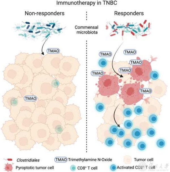 研究借助多维组学分析发现,三阴性乳腺癌患者中免疫调节亚型(Immunomodulatory, IM。即,对免疫治疗可产生应答组)的乳腺微环境中,梭菌目下菌属的占比显著高于其他亚型患者,提示瘤内共生菌群可能与抗肿瘤免疫应答有关。结合代谢数据分析发现,梭菌相关代谢产物TMAO在IM亚型患者中的丰度更高,且与微环境内CD8+ T细胞比例和gamma干扰素表达量成正相关。体内外实验证明,组织内TMAO诱导乳腺癌细胞发生由GSDME介导的焦亡,向微环境内释放大量炎性因子,从而实现对肿瘤特异性CD8+ T细胞募集和功能活化。同时发现,TMAO可活化内质网应激相关的PERK蛋白,继而切割GSMDE的上游蛋白caspase-3诱导肿瘤细胞发生焦亡。通过给小鼠喂食TMAO前体物胆碱可提高血浆和瘤内TMAO水平,激活三阴性乳腺癌抗肿瘤免疫,提高免疫治疗疗效。因此,补充胆碱摄入可以作为提高三阴性乳腺癌免疫治疗疗效的临床潜在治疗策略。