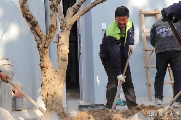 复旦大学邯郸校区本部绿地,是杨四保和同事们的“地盘”。种植花木、修剪树木、维护草坪、移植加固、清理打扫……一支总共30多人的队伍,包揽了绿化、保洁等工作。绿化员们一年四季忙碌,尤其春天。每年植树节前后,他们都会种植新树,并对已有花木进行调整。