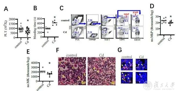 近期,复旦大学公共卫生学院张玉彬课题组在镉的造血毒性研究领域取得新的进展,研究成果以 “Cadmium Suppresses Bone Marrow Thrombopoietin Production and Impairs Megakaryocytopoiesis in Mice”为题发表于毒理学领域权威期刊 Toxicological Sciences 。本研究利用小鼠模型,首次揭示了长期环境浓度的镉暴露通过抑制骨髓中促血小板生成素(TPO)的产生从而引起巨核细胞祖细胞(MkP)的c-Myc信号减弱,其结局是MkP分裂分化下降,血小板生成障碍,最终导致血小板数量下降和机体凝血功能障碍;同时,本研究表明当机体暴露于环境浓度的镉,传统理念认为的镉对血小板的直接毒性效应在体内并不起主导性的生物学作用。该研究首次从镉对血小板分化发育影响的角度来阐明镉的造血毒性,具有重要的毒理学意义和公共卫生意义。