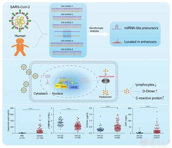新冠特效药研发如火如荼,先是美国默沙东的莫努匹韦(Molnupiravir)和辉瑞的帕昔洛韦(Paxlovid)相继获批上市或紧急使用;紧随其后,我国原创新冠口服药物VV116近日将在乌兹别克斯坦获批上市。这些药物的共同特点是以病毒为靶点进行治疗,包括阻断病毒进入细胞、阻止病毒复制等,但能否应对新冠病毒的不断变异仍需进一步探索,应对新冠变异,我们需要新思路。新冠病毒致病的关键分子是什么?新冠肺炎临床症状的物质基础又是什么?新冠肺炎治疗是否有新的策略呢?近期,复旦大学生物医学研究院于文强教授与合作者在柳叶刀旗下刊物EbioMedicine正式发表题为SARS-CoV-2 RNA elements share human sequence identity and upregulate hyaluronan via NamiRNA-enhancer network的研究论文,为上述问题的解答提供了全新的线索和思路。