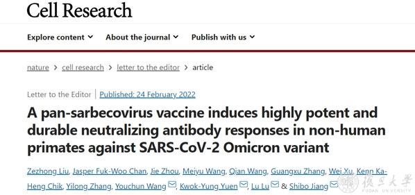 2月24日,复旦大学基础医学院姜世勃/陆路团队联合香港大学袁国勇院士和中检院王佑春团队在 Cell Research 杂志在线发表了题为“A pan-sarbecovirus vaccine induces highly potent and durable neutralizing antibody responses in non-human primates against SARS-CoV-2 Omicron variant”的研究论文,报道了基于新型STING激动剂CF501为佐剂和原始SARS-CoV-2 RBD-Fc蛋白的疫苗可在恒河猴动物模型上诱导出针对奥密克戎变异株的强效且持久的交叉中和抗体应答,进一步验证了该“以不变应万变”的研发广谱抗病毒疫苗策略。