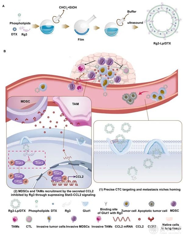 复旦大学药学院王建新课题组于2月11日在《科学进展》(Science Advances)上发表了题为“Versatile ginsenoside Rg3 liposomes inhibit tumor metastasis by capturing circulating tumor cells and destroying metastatic niches”的研究成果,设计了一种简单高效的新型多功能人参皂苷脂质体,在靶向捕获CTC的同时破坏癌细胞转移微环境,从而达到了显著的抑制三阴性乳腺癌肺转移效果。
