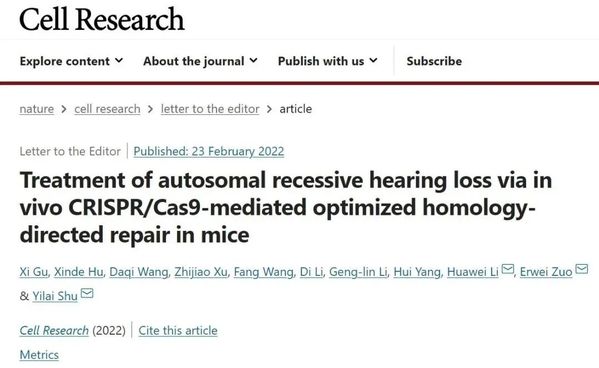 近日,Cell Research 在线发表了复旦大学附属眼耳鼻喉科医院舒易来主任、李华伟教授题为“Treatment of autosomal recessive hearing loss via in vivo CRISPR/Cas9-mediated optimized homology-directed repair in mice”(CRISPR/Cas9介导优化型同源修复策略治疗常染色体隐性遗传性耳聋)的报道。该研究用高效的基因治疗递送载体以转染听觉内毛细胞,用一种优化的HMEJ(同源臂介导的末端接合)的基因敲入方法精准修复Klhl18lowf耳聋模型的点突变,实现在体Klhl18lowf基因有效编辑,恢复感受声音的内毛细胞静纤毛形态,并纠正耳聋小鼠模型的听觉功能长达治疗后6个月。这是首个基于CRISPR/Cas9-HMEJ技术治疗隐性遗传性感音神经性聋成功的研究,为遗传性耳聋的精准治疗以及临床转化提供了强有力的科学证据。