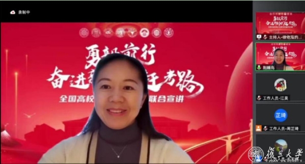 复旦大学博士生讲师团团长毛天婵表示,本次联合宣讲活动有两个“新”:第一个“新”是主题设计新,迈入2022年,广大青年站在新时代的新起点,既承接历史的光辉积淀,更需要赓续使命、继往开来,面对新机遇、新形势,做好新时代的“答卷人”;第二个“新”是宣讲形式新,本次活动有幸获得全国多所高校的热情支持,参与讲师不仅有在校研究生,还有奋战在一线的基层选调生,展现出理论宣讲从信仰出发、在专业落脚、扎根祖国大地的突出特色。