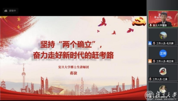 “要走好新的赶考之路,不能没有领路者和探路人”,复旦大学博士生讲师团的蒋捷同学在宣讲中说。蒋捷表示,“两个确立”以统一的核心和指导思想保持我党带领全国人民前进的方向一致性。有共产党的领导,有坚强的领导核心和科学的指导思想,广大青年一定能走好新时代的“赶考路”。