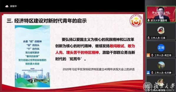 来自中国人民大学马克思主义学院博士生宣讲团的喻伟、武汉大学博士生宣讲团的郑传帮、习近平新时代中国特色社会主义思想北京航空航天大学研究生宣讲团的胡应桃、西安交通大学学生微宣讲团的冉晓琳和大连理工大学博士生宣讲团的周天傲等5位学生,以“五位一体”总体布局为切入点,分别从中国特色社会主义政治建设、经济建设、文化建设、社会建设和生态文明建设五个方面讲述了新时代党和国家在发展路上取得的历史性成就,阐明了其对于青年一代的启示。武汉大学的郑传帮同学在宣讲中向广大青年学子发出号召:“伟大的时代铸就伟大的精神。经济特区建设对新时代青年的启示就是要敢闯敢试、敢为人先、埋头苦干。作为新时代青年,应发扬特区精神,拒绝‘躺平’。”