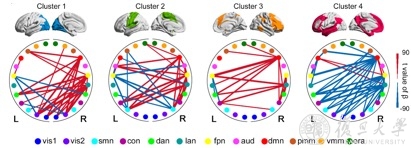 图3.4个社团的动态偏侧化主要受与高级网络(默认网络、语言网络、注意网络)的连接驱动。