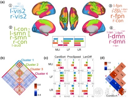 图2. (a)DLI空间上可以按时间同步性分为4个社团。(b)不同脑区的DLI的时间同步性。(c-d)平均DLI(mean laterality index,MLI)、偏侧波动、偏侧反转、社团间偏侧性耦合与认知能力相关。