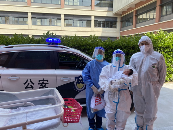 经过多方努力,最终患儿辖区派出所派车来接其回家,68病区派出张澜医生和袁皓护士,身穿大白护送小冉回家,直到小区楼道口,与小冉妈妈核对信息,送上临床营养科和社工部协调捐赠的奶粉,并将孩子放心地交到妈妈手中。