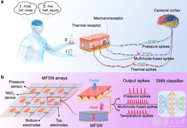 近日,复旦大学刘琦教授团队报道了一种结构紧凑的多模态融合感知脉冲神经元(MFSN)阵列,该阵列由异质集成的压力传感器和NbOx忆阻器构成,其中压力传感器用来感知压力,NbOx忆阻器用来产生脉冲输出并感知温度变化。当压力和温度两种激励同时作用于MFSN时,多模态的模拟感觉信息可以融合为一个脉冲序列,显示了其优异的数据压缩和脉冲转换能力。上述成果于2022年4月份以题“A Heterogeneously Integrated Spiking Neuron Array for Multimode-Fused Perception and Object Classification”发表在国际知名学术期刊Advanced Materials上。