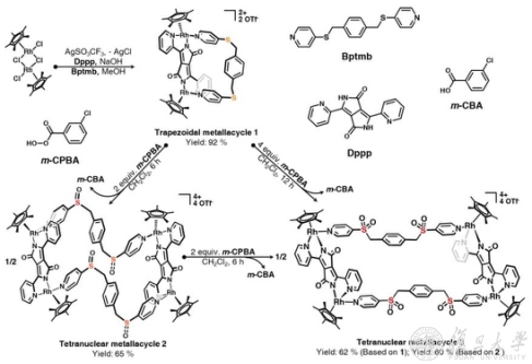 近日,复旦大学化学系金国新教授课题组将硫醚化合物的可控氧化发展成为一种结构后修饰的方法,即利用含有硫醚单元的双吡啶配体与多齿配体在金属角的作用下构筑成一系列有机金属超分子化合物,之后通过精确控制氧化剂的加入量来实现超分子结构中硫醚配体的可控氧化,不但实现了由双核有机金属大环到四核有机金属大环化合物的刺激响应性超分子结构的转化,而且也实现了由分子Borromean环到四核有机金属大环化合物的刺激响应性拓扑的转化。相关成果发表在Angew. Chem. Int. Ed.上。