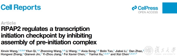 2022年4月26日,复旦大学陈曦子、徐彦辉、陈飞团队合作在Cell Reports杂志在线发表题为“RPAP2 regulates a transcription initiation checkpoint by inhibiting assembly of pre-initiation complex” 的研究论文。该研究发现细胞内存在一个与Pol II紧密相互作用的蛋白 —— RNA聚合酶II相关蛋白(RNA polymerase II-associated protein 2,RPAP2),解析人源RPAP2-Pol II的高分辨结构,结合结构和生化分析,揭示了RPAP2抑制基因转录起始的分子机制。