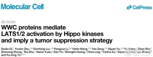 2022年4月15日,复旦大学生物医学研究院/复旦大学附属儿科医院余发星课题组在《分子细胞》(Molecular Cell)杂志以长文形式发表了题为“WWC proteins mediate LATS1/2 activation by Hippo kinases and imply a tumor suppression strategy”的研究论文。该研究揭示了WWC蛋白家族(WWC1/2/3)在MST1/2激活LATS/2过程中的重要功能及分子机制,并基于此机制开发了SuperHippo迷你基因,后者能够特异性激活LATS1/2并显著抑制多种肿瘤的发生。