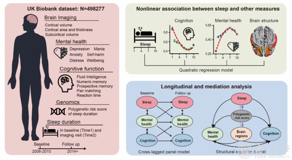 2022年4月28日,复旦大学类脑智能科学与技术研究院冯建峰教授/程炜青年研究员团队利用大数据分析方法对近50万人的基因、影像、行为等多维度数据开展研究,相关成果以“睡眠时长与认知功能、精神健康非线性关系的脑结构与遗传机制”(The brain structure and genetic mechanisms underlying the nonlinear association between sleep duration, cognition and mental health)为题发表于Nature子刊Nature Aging。
