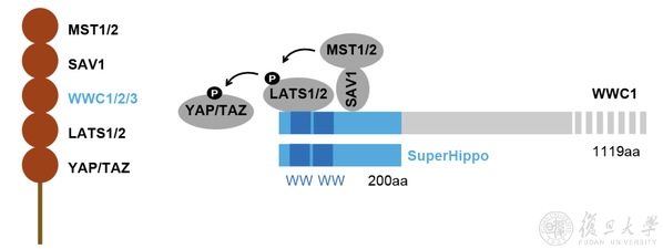 4月15日,生物医学研究院余发星课题组在Molecular Cell杂志以长文形式发表了题为《WWC蛋白介导Hippo信号抑制肿瘤发生》(WWC proteins mediate LATS1/2 activation by Hippo kinases and imply a tumor suppression strategy)的研究论文。该研究揭示了WWC蛋白家族(WWC1/2/3)在MST1/2激活LATS/2过程中的重要功能及分子机制,并基于此机制开发了SuperHippo迷你基因,后者能够特异性激活LATS1/2并显著抑制多种肿瘤的发生。