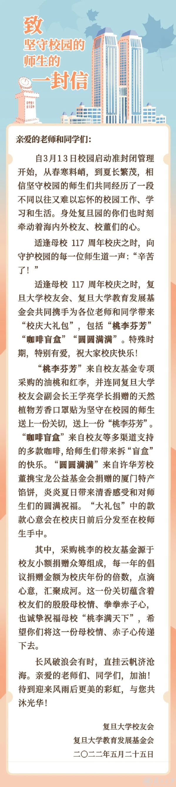 今天,复旦大学校友会与复旦大学教育发展基金会共同向坚守校园的师生们发出了一封信,期待共同迎来风雨后更美的彩虹,一起共沐光华!